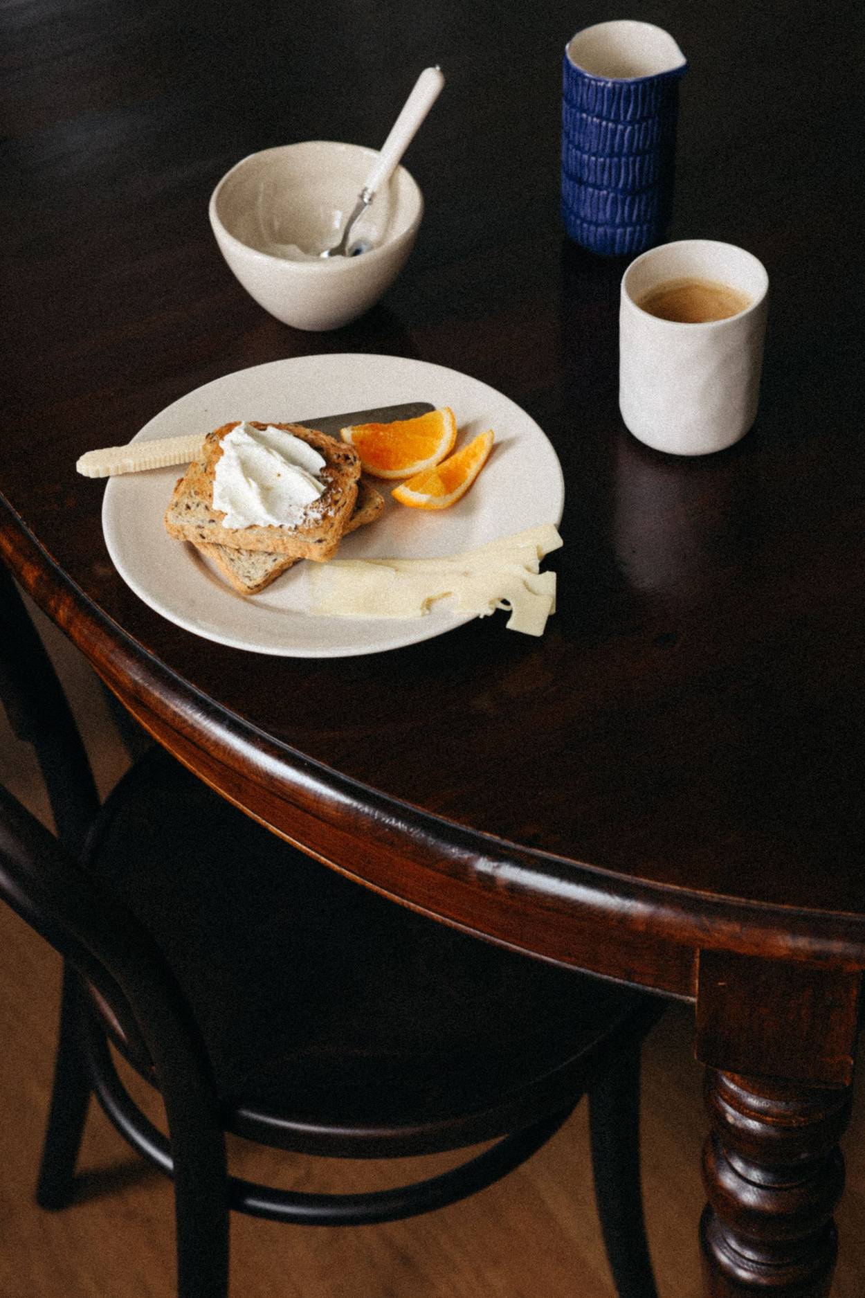 Idag bjuder Mona sina närmaste vänner på brunch. Nybakat bröd, färsk frukt och kaffe står framme på bordet, medan keramiken tyst ramar in stunden. De mjuka glasyrerna och de handgjorda ytorna fångar morgonljuset på olika sätt under timmarnas gång. Ibland kan en helgbrunch sträcka sig över hela dagen och övergå i eftermiddagste och till och med middag. Under sådana dagar rör sig keramiken sömlöst mellan tillfällena: från tidig morgon till långa kvällar runt samma bord.
